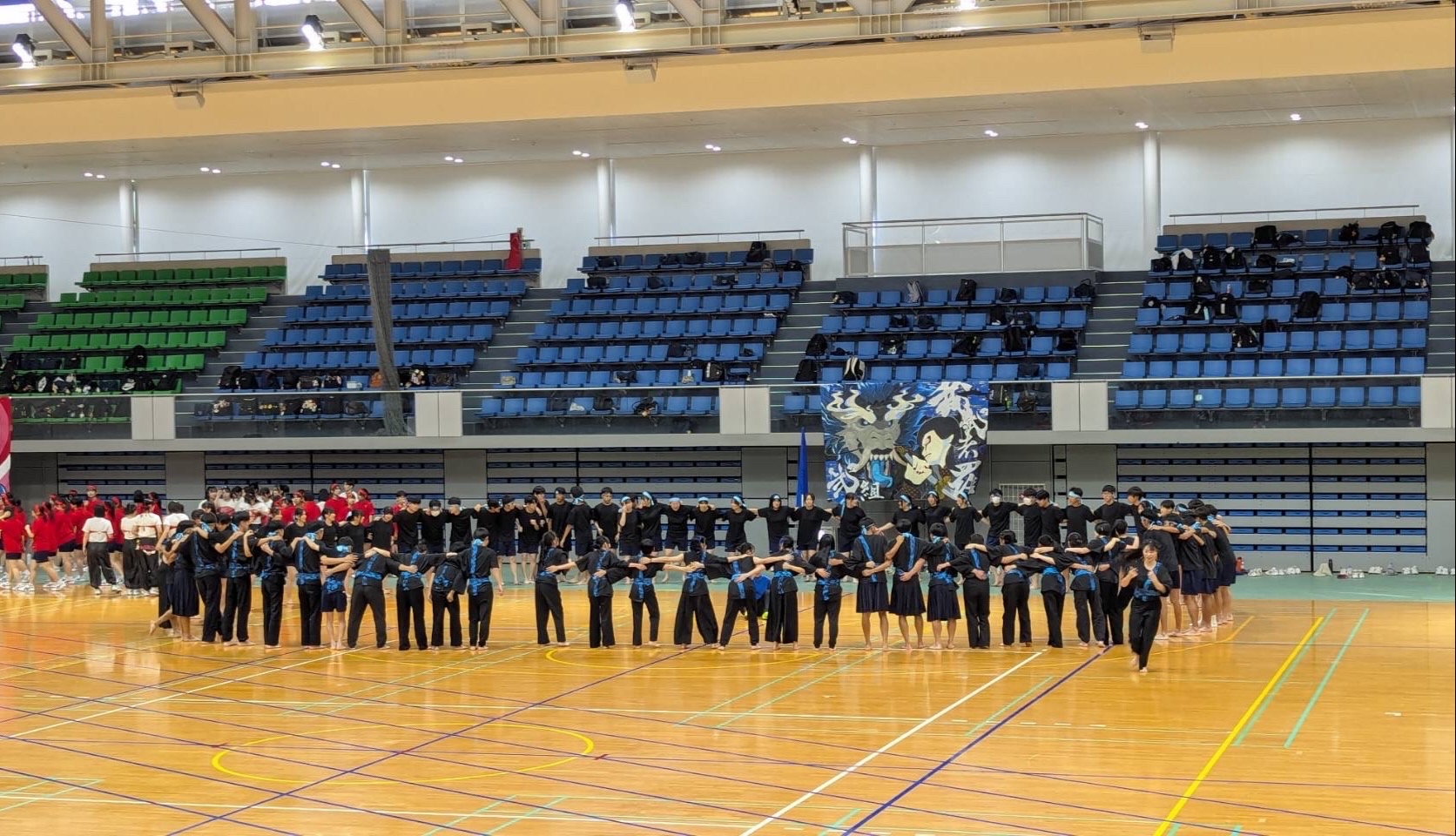 まずは体育祭を紹介します!島商の体育祭は家政科が赤、情報処理科が青、商業科が黄色に分かれて競技を行い競い合います。例年までは運動場での開催でしたが、今年は復興アリーナで開催されました。室内で体育祭をすることは初めてだったのでとても新鮮な気持ちで楽しむことができました!